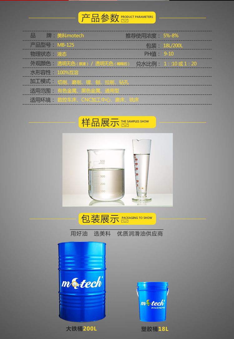 东莞美科铝合金合成切削液,具有优秀的润滑性能,防锈性能和冷却性能。废屑沉淀快,含有特效防氧化成份,可有效杜绝铜合金和铝合金工件在加工后出现白斑或发黑等氧化变色现象,适用于铝合金、铜合金、不锈钢、合金钢、铸铁、高碳钢等材料的切削、磨削、钻孔、冲压等金属加工方式。